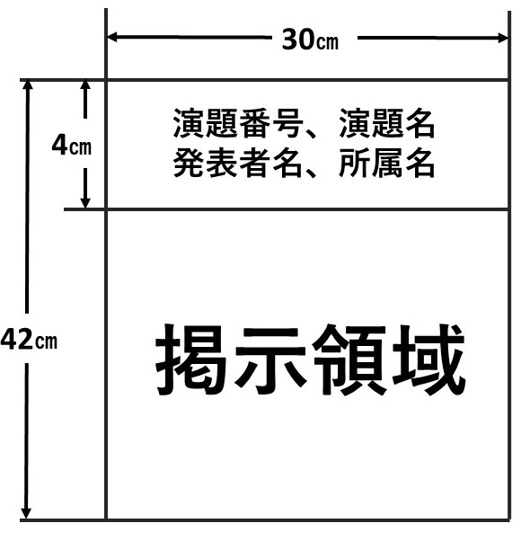 2. ポスターの大きさは,縦 42 cm× 横 30 cmのA3サイズです.(大きさの変更はできません)上部に演題番号,演題名,演者名,所属を記載してください.本文,図表,写真等は,この範囲内に1枚で収めてください.