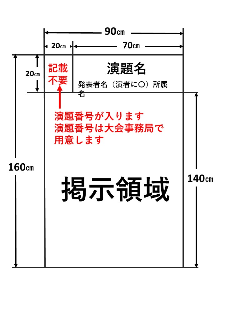 3. 掲示可能な領域は,上部20㎝に演題番号(左端20㎝)演題名,演者名,所属を記載してください.本文,図表,写真等は縦140㎝×横90㎝の範囲でポスター1枚に収めてください.