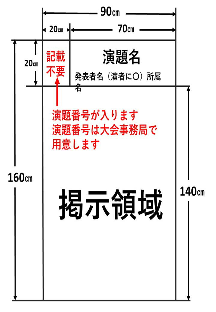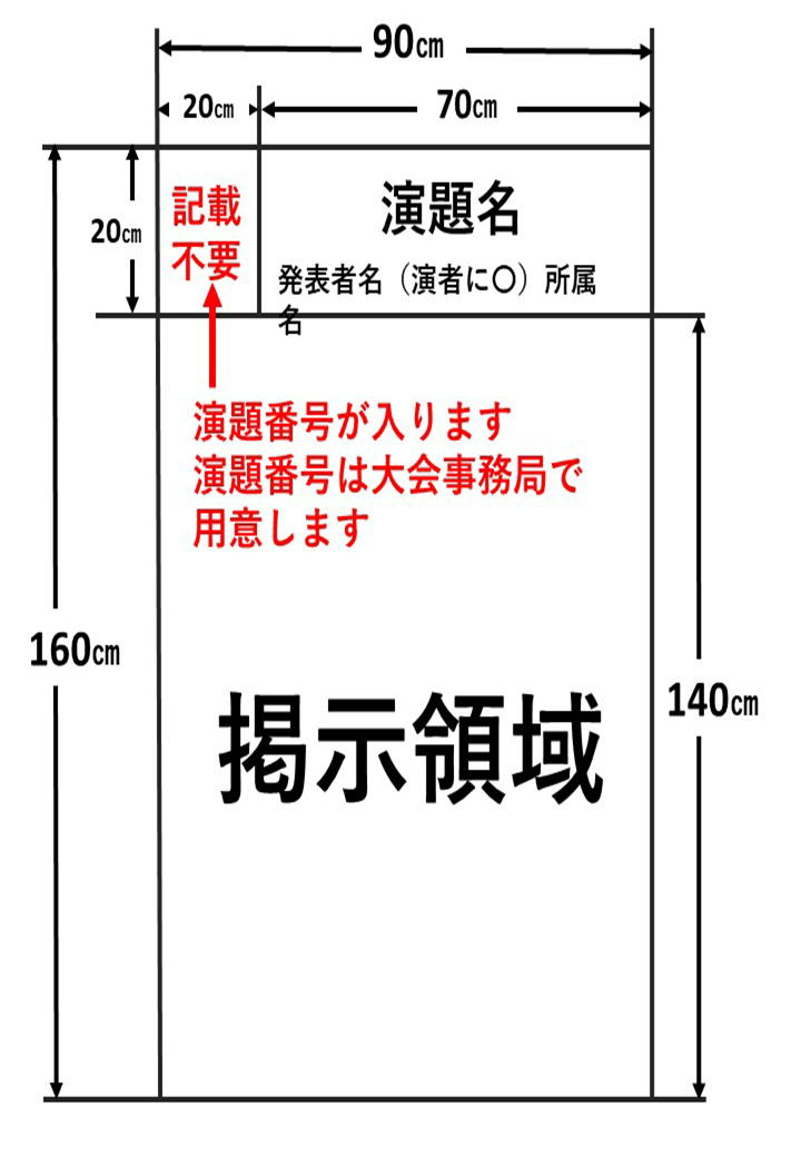 2. 掲示可能な領域は,上部20cm右端70㎝に演題名,発表者名 (演者名の前には○印),所属を記載してください.本文,図表,写真等は縦140cm× 横90cmの 範囲でポスター1枚に収めてください.